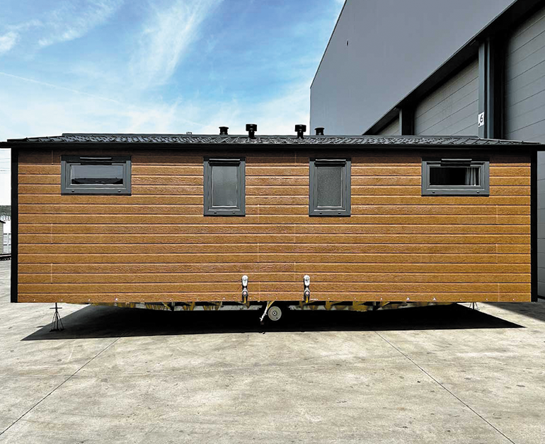 Nueva casa móvil Nidify con acabado exterior Canexel Sierra y ventanas antracita. Cubierta de una sola pendiente en color negro.